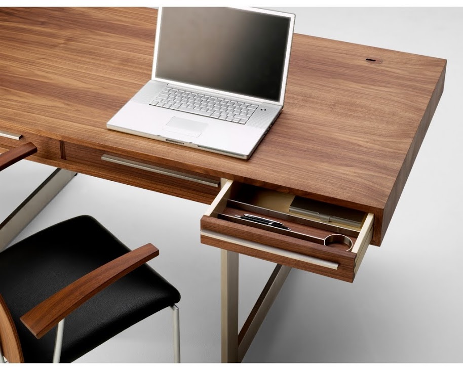 Schreibtisch mit Kabelführungen in der Tischplatte,