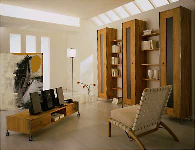 Modell 112 in europ. Kirschbaum geölt, Schranktüre mit satinierten Glasfüllungen, Kombination 112-06, B ca. 270 H 223,6 T 40,5/25 cm. TV-Wagen TVW 136: B 136,2 H 32 T 52,5 cm.