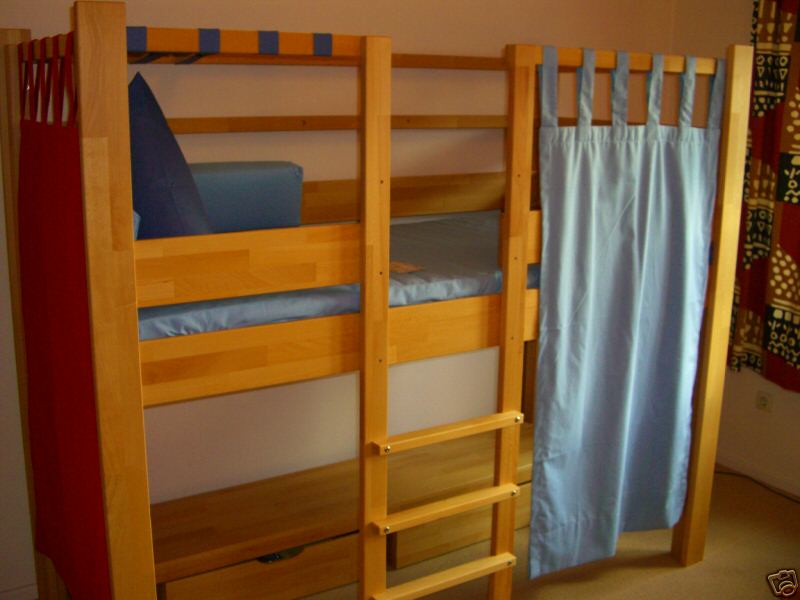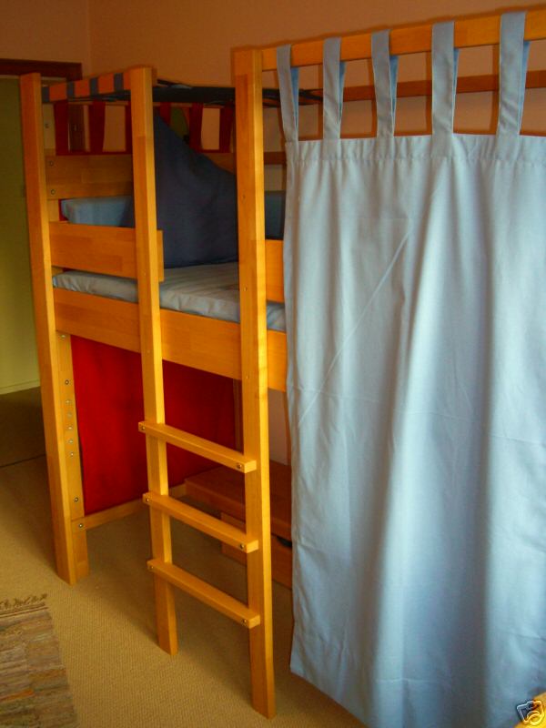 DeStyle Hochbett, Regal 111, 2 Schubkästen mit Sitzplatte, 2 Vorhänge, 1 kleiner Baldachin, 1 Kissen, 2 Zargenpolster und Matratzenbezug.